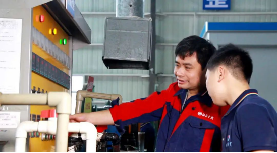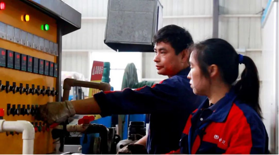 ▲劉學文正在給同事演示機器操作