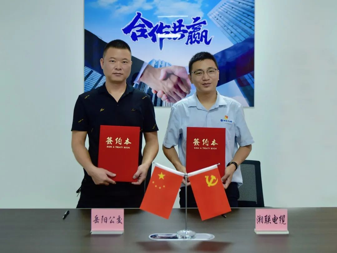 ▲湘聯電纜品牌總監楊潔和岳陽市公共交通集團李彪副書記代表雙方簽署合作協議