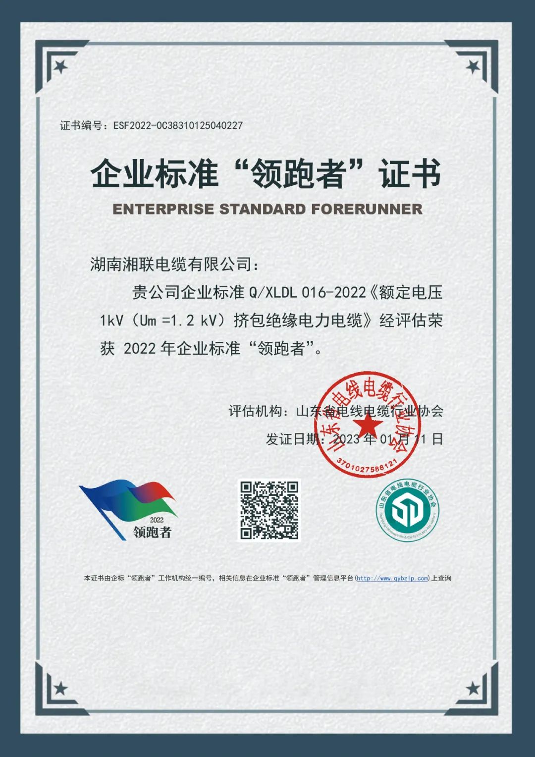 近日,湖南湘聯(lián)電纜有限公司企業(yè)標(biāo)準(zhǔn)Q/XLDL 010-2022《額定電壓 6kV(Um=7.2kV)到 35kV(Um=40.5kV)擠包石墨烯內(nèi)外屏蔽交聯(lián)聚乙烯絕緣電力電纜》、Q/XLDL 016-2022《額定電壓 1kV(Um =1.2 kV)擠包絕緣電力電纜》、Q/XLDL 017-2022《額定電壓450/750V及以下銅芯聚氯乙烯絕緣環(huán)保家裝布電線》三項(xiàng)產(chǎn)品經(jīng)評(píng)定機(jī)構(gòu)評(píng)估,榮獲2022年全國(guó)企業(yè)標(biāo)準(zhǔn)“領(lǐng)跑者”。