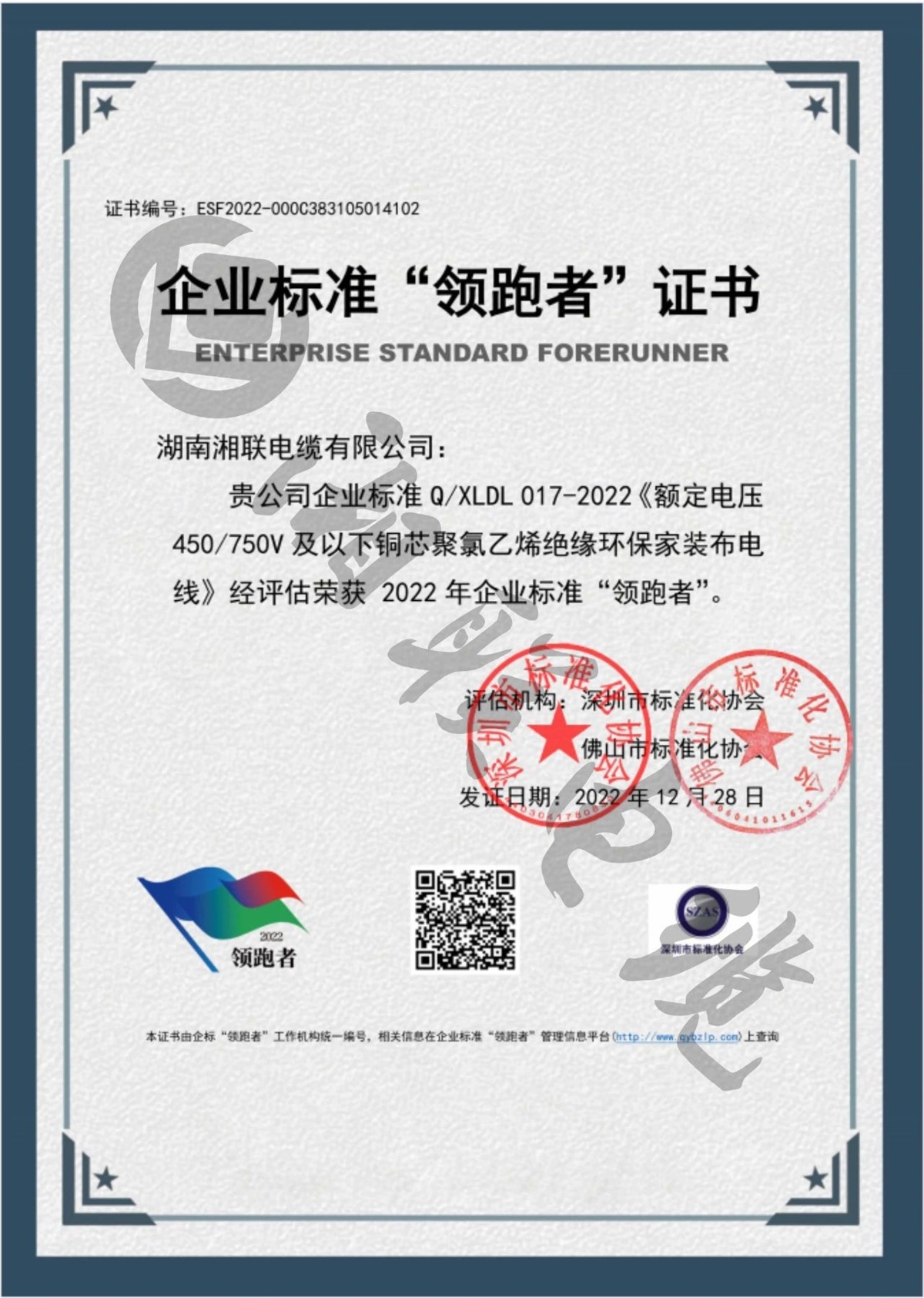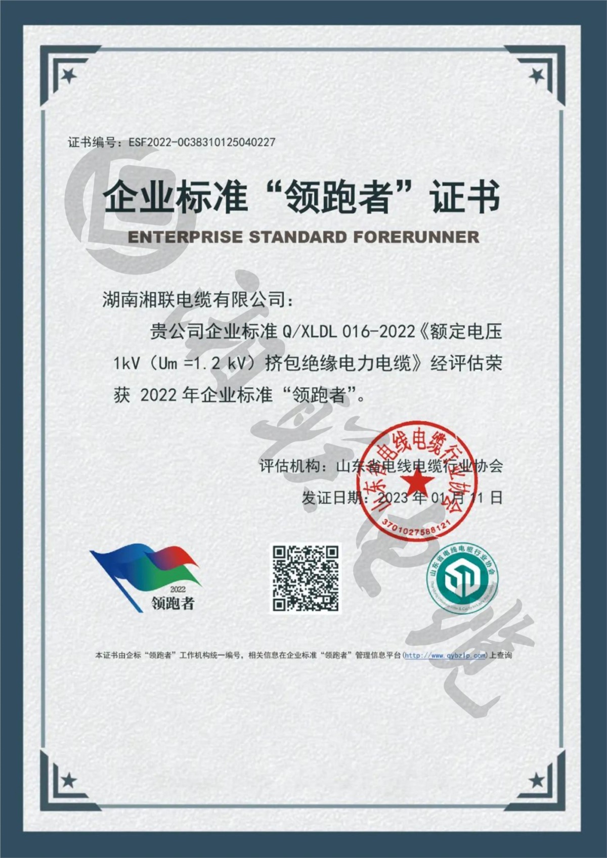1月,湖南湘聯(lián)電纜有限公司三項(xiàng)企業(yè)標(biāo)準(zhǔn)經(jīng)評定,榮獲2022年全國企業(yè)標(biāo)準(zhǔn)“領(lǐng)跑者”。