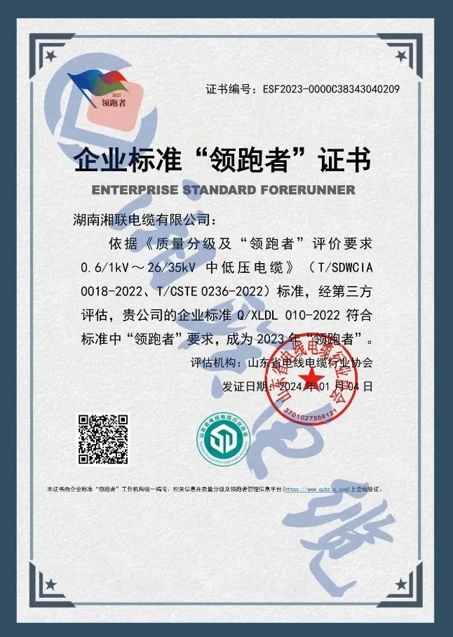 二月,企業標準領跑者管理信息平臺公布了2023年企業標準領跑者名單,湖南湘聯電纜有限公司憑借企業標準Q/XLDL 010-2022,成為2023年企業標準“領跑者”,湘聯電纜連續三年獲此殊榮。