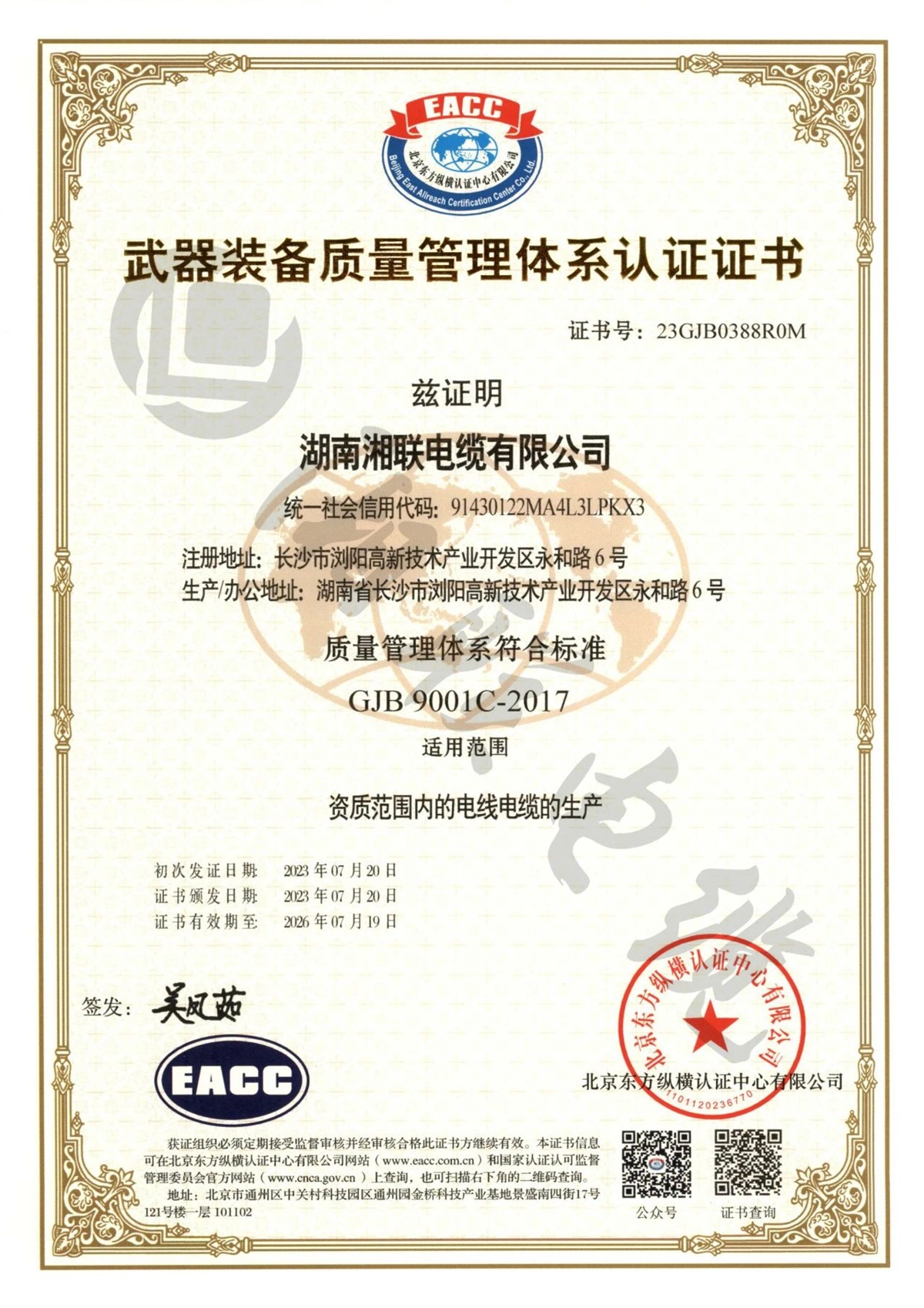 國防和軍隊建設是國家安全的堅強后盾。電線電纜是國防建設不可或缺的基礎設施,它支撐著通信、指揮、探測與偵察系統的穩定運行,是軍隊戰斗力的重要保障。作為電線電纜行業知名品牌,近年來,湘聯電纜以習近平強軍思想和習近平總書記關于武器裝備質量建設的重要論述精神為指導,有序開展軍用電線電纜研發生產工作。